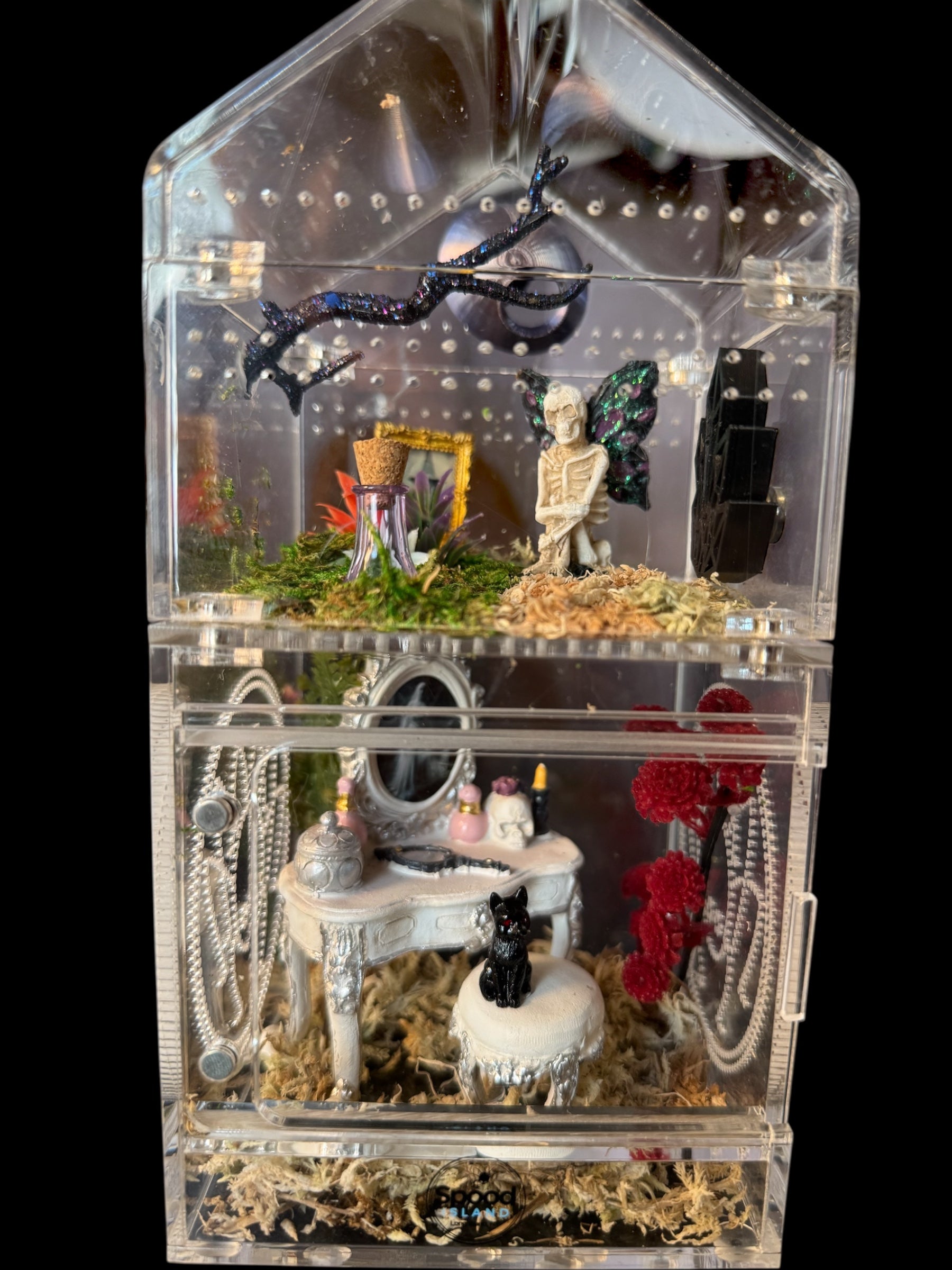 This 2 story Spooky House features a convertible jumping spider enclosure with a moss-covered divider for privacy. It can house two baby jumpers and easily converts into an adult single spood house. Enjoy watching your spiders grow in this unique and versatile home.